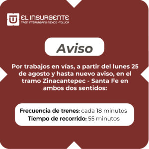 A partir del lunes 25 de agosto y hasta nuevo aviso, el servicio en el tramo Zinacantepec – Santa Fe, en ambos sentidos, operará con los siguientes ajustes: